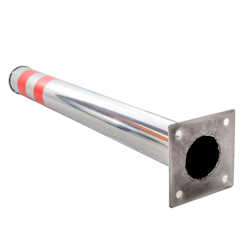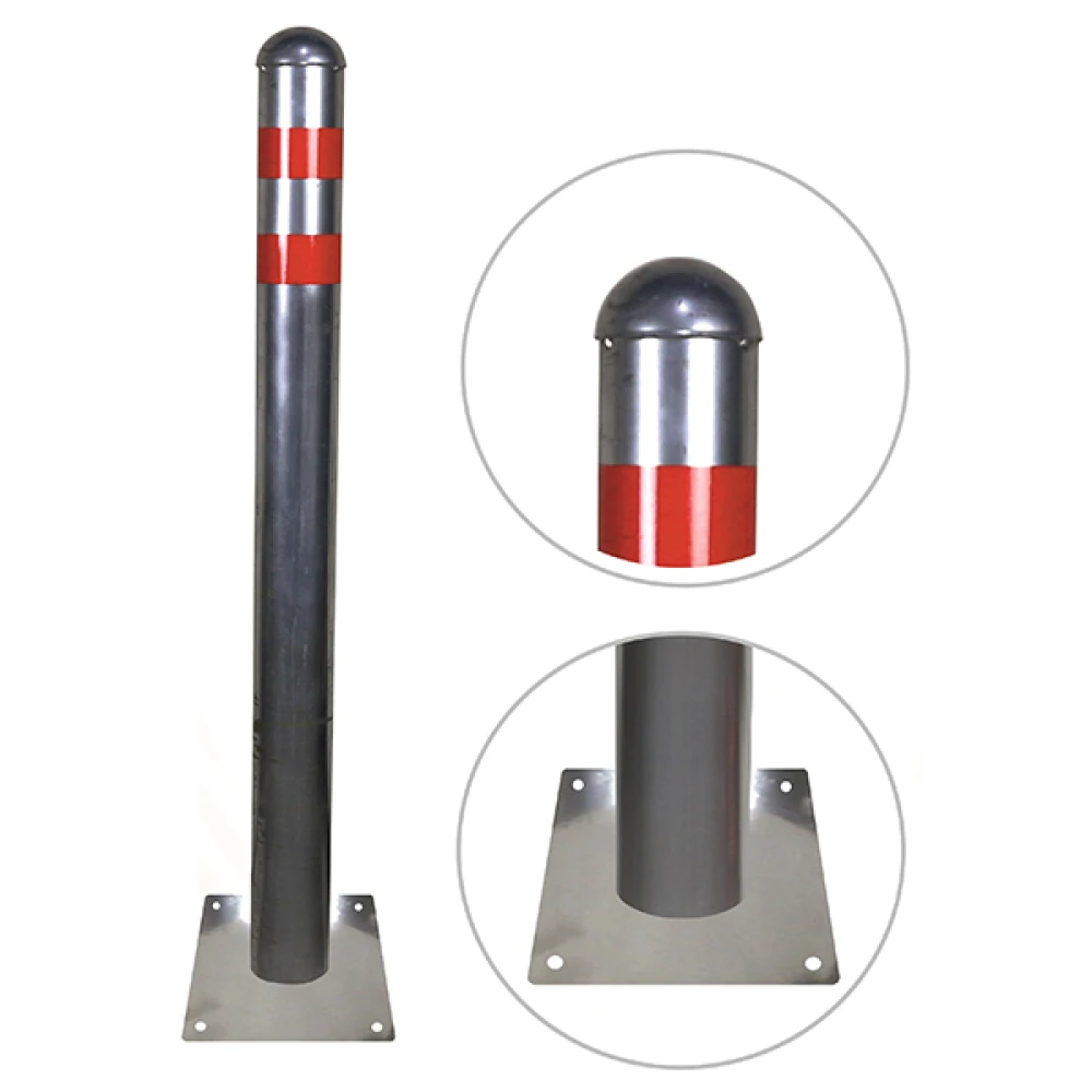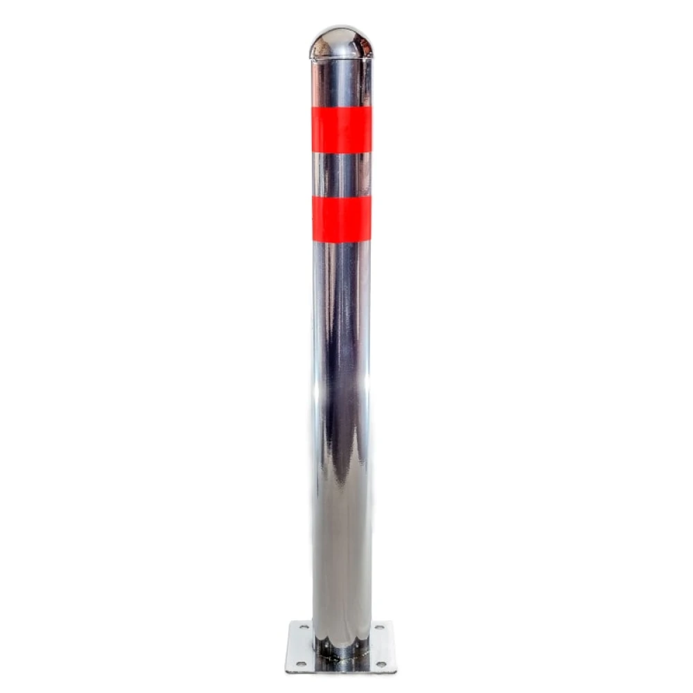 Анкерный столбик СМА-76.000-1 СБ выполнен из стальной трубы диаметром 76 мм и толщиной 1,5 мм. Сверху приварена металлическая полусфера, которая плотно прилегает к столбу и не допускает попадания осадков внутрь столбика. Покрытие — порошковая краска цвета Хром и две красные светоотражающие наклейки, которые позволяют заметить антипарковочный столбик даже в темное время суток. Покрытие столбика надежно защищает от осадков и реагентов, долгое время не допускает коррозию металла. Можно дополнить ушками для крепления цепи.