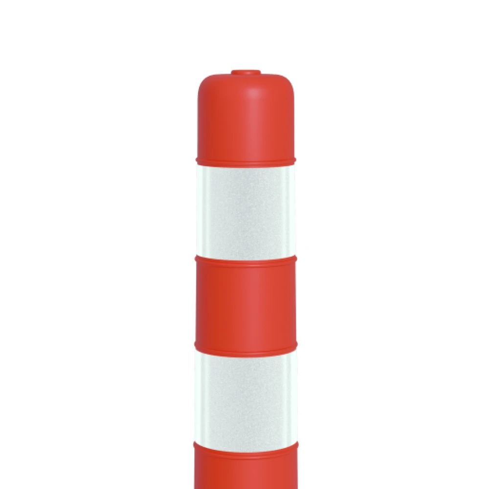 Гибкий дорожный столбик изготавливается из эластичных полимерных материалов, которые при наезде транспортных средств обеспечивают оперативный возврат изделия в исходное положение. На корпусе столбика нанесена горизонтальная разметка из световозвращающей пленки, полосы нанесены по две штуки в горизонтальном порядке.