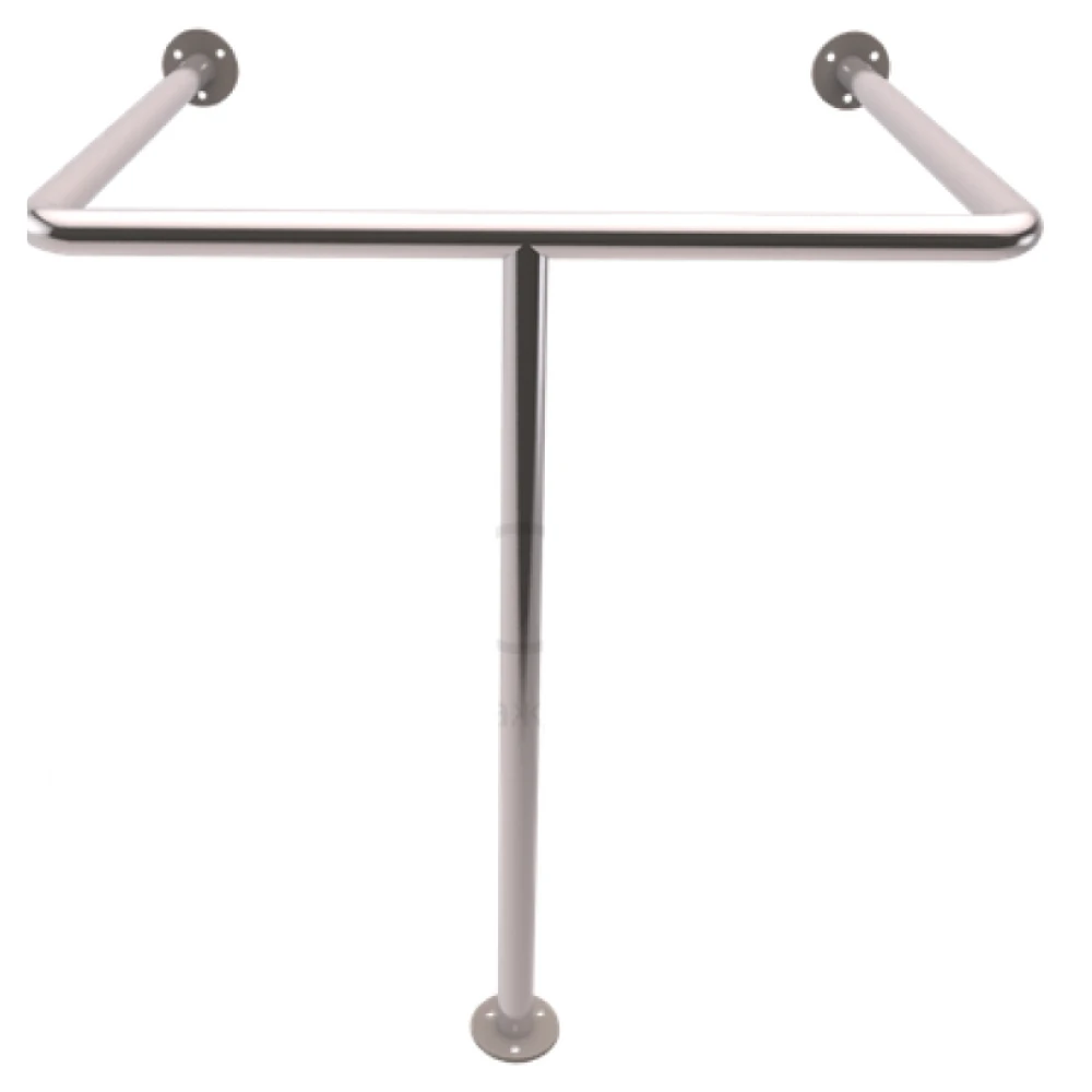 Поручень опорный тройной для раковины с креплением к полу и стенам, служит надежной опорой для людей с ограничениями по здоровью. Поручень имеет надежную конструкцию, а так же позволяет беспрепятственно подъехать человеку в кресле коляске. Поручень устанавливается в административных и торговых зданиях, медицинских учреждениях, детских садах и школах и служит опорой для людей с ограниченными возможностями в санитарных комнатах, вокруг раковины. Конструкция поручня имеет форму и ширину, удобную для захвата кистью руки, является травмобезопасной не имеет стыков на поверхности и острых углов. Данные модели поручней изготавливаются из нержавеющей стали марки AISI 304, диаметром 32мм.