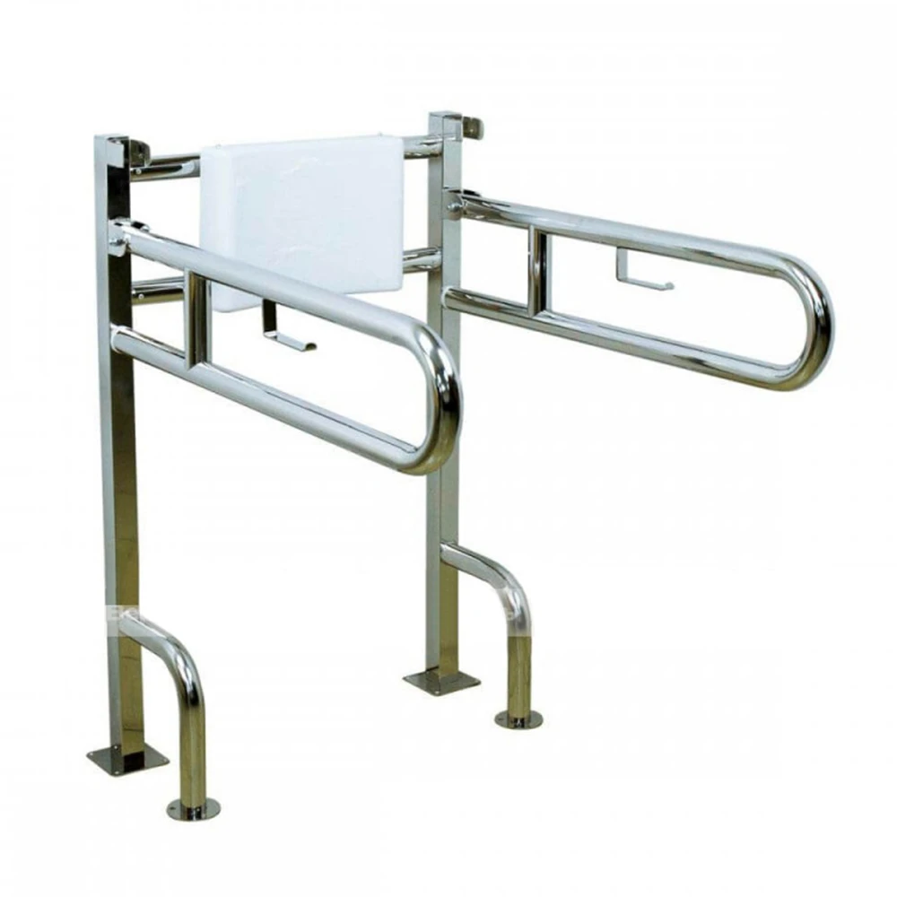 Устройство состоит из 2-х откидывающих поручней с креплением в пол и имеет специальную спинку ортопедической формы изготовленную из пластика, данная спинка предназначена для поддержки спины и предотвращения смещения унитазного бачка при облокачивании на нее. Изделие имеет прочную цельносваренную конструкцию. Конструкция имеет встроенный бумагодержатель.