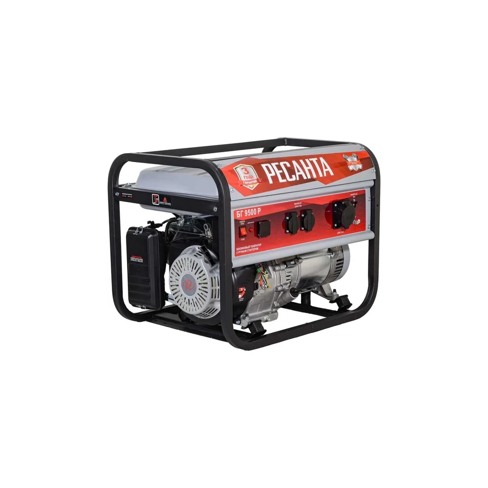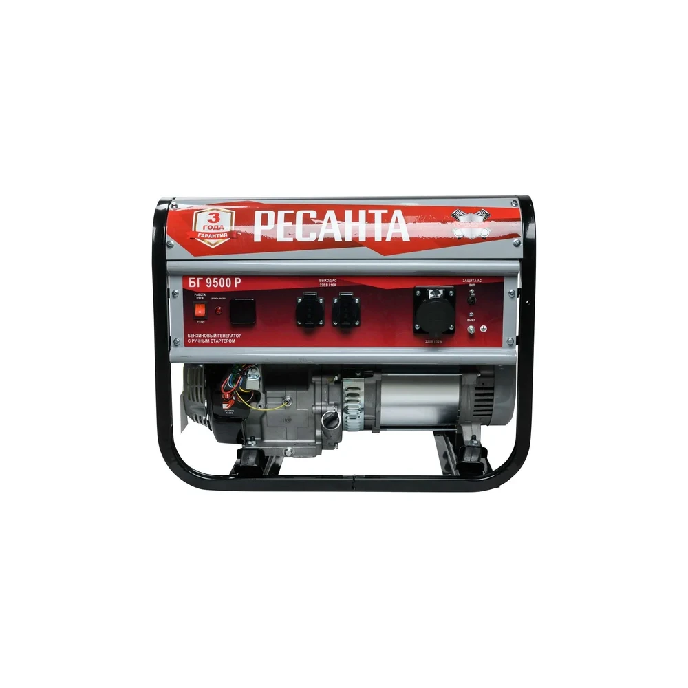 Бензиновый генератор Ресанта БГ 9500Р мощностью 7500 Вт с ручным стартером и 25-литровым топливным баком обеспечит бесперебойную работу электроприборов и оборудования в местах, где отсутствует центральное энергоснабжение, или в случае временного отключения электричества.