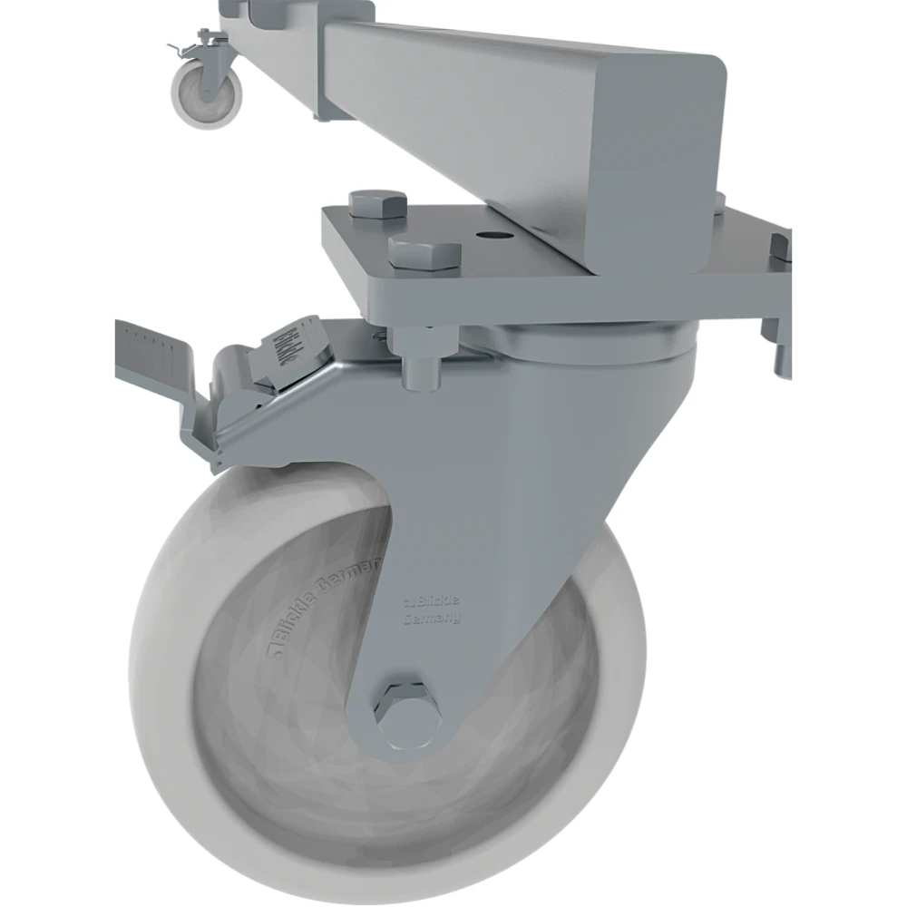 2 поворотных колёсных опоры 125×30 мм с фиксацией угла поворота и тормозом.