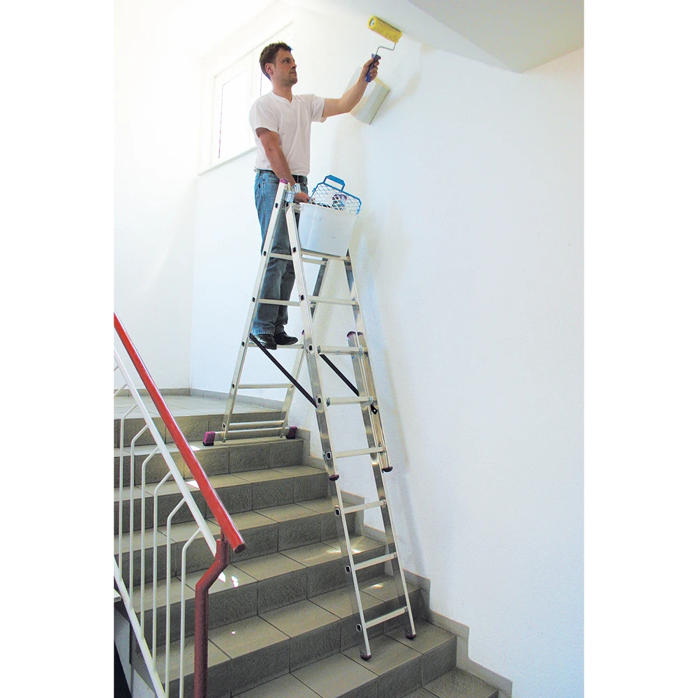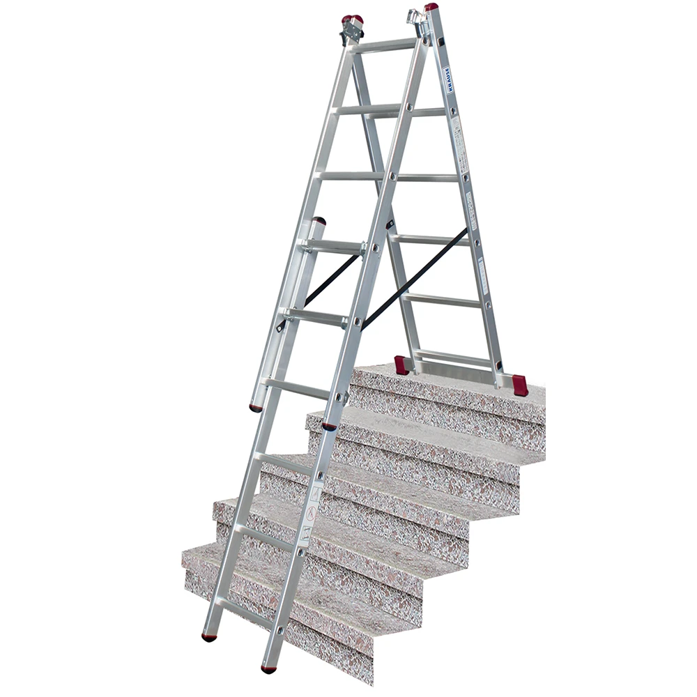 - Алюминиевая трехсекционная лестница с перекладинами, универсального применения: может использоваться как приставная и выдвижная лестница или как стремянка