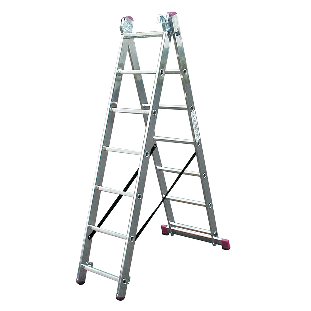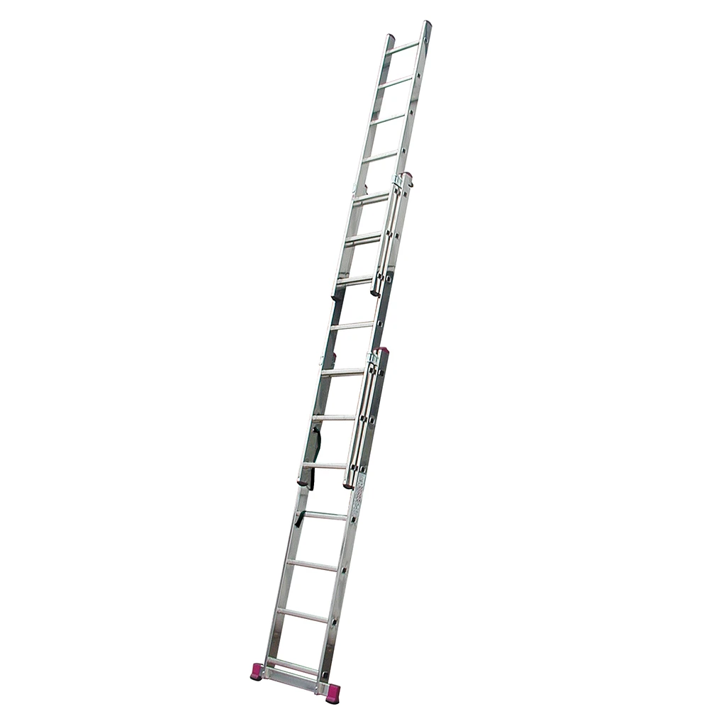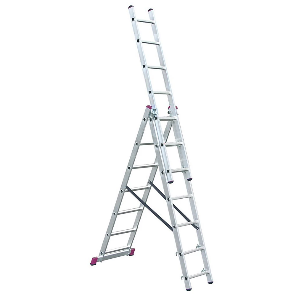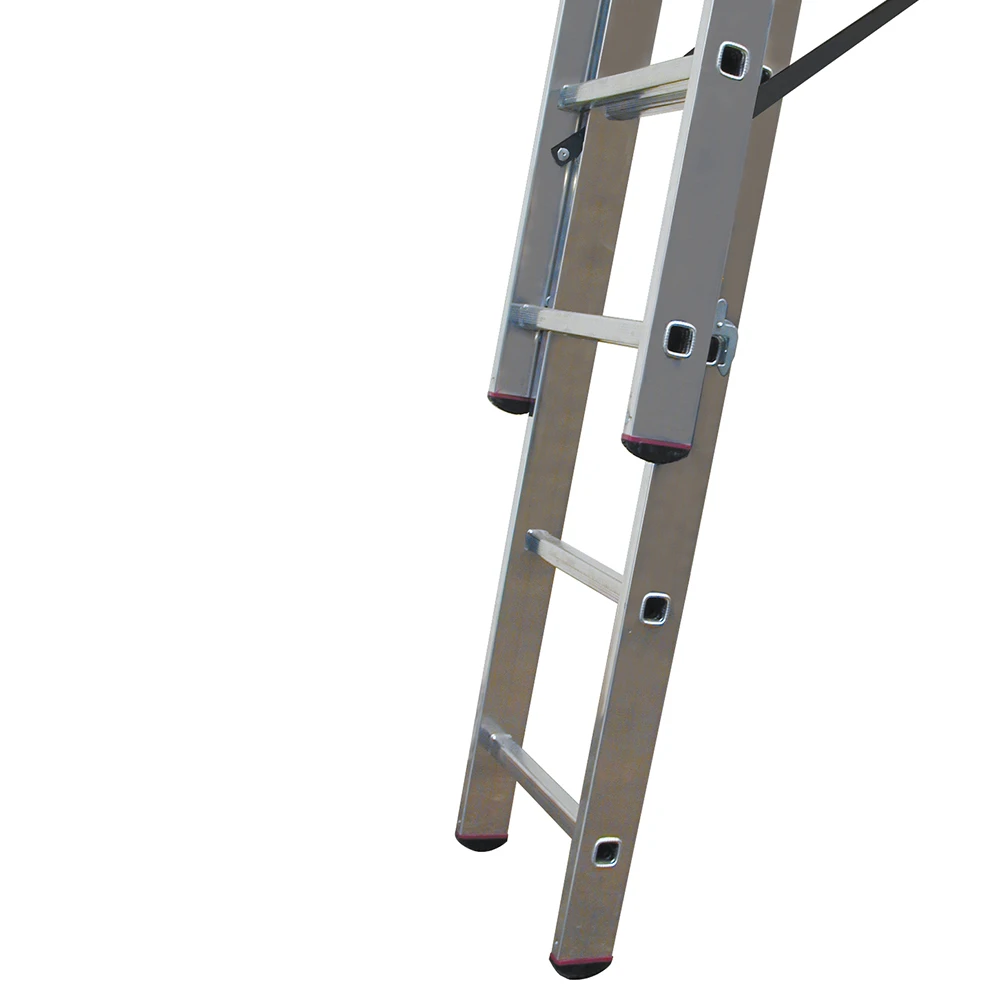 - Алюминиевая трехсекционная лестница с перекладинами, универсального применения: может использоваться как приставная и выдвижная лестница или как стремянка