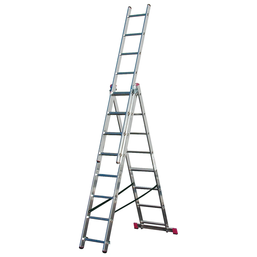 - Алюминиевая трехсекционная лестница с перекладинами, универсального применения: может использоваться как приставная и выдвижная лестница или как стремянка