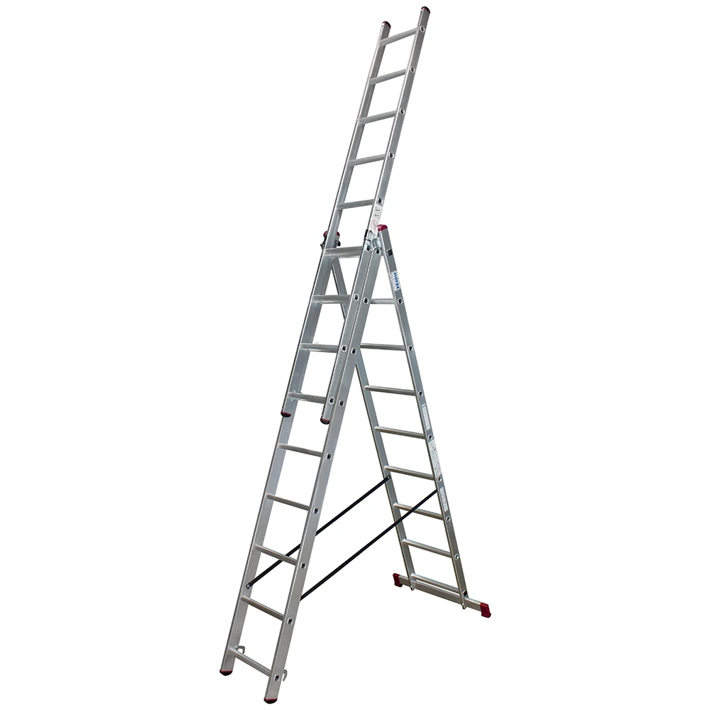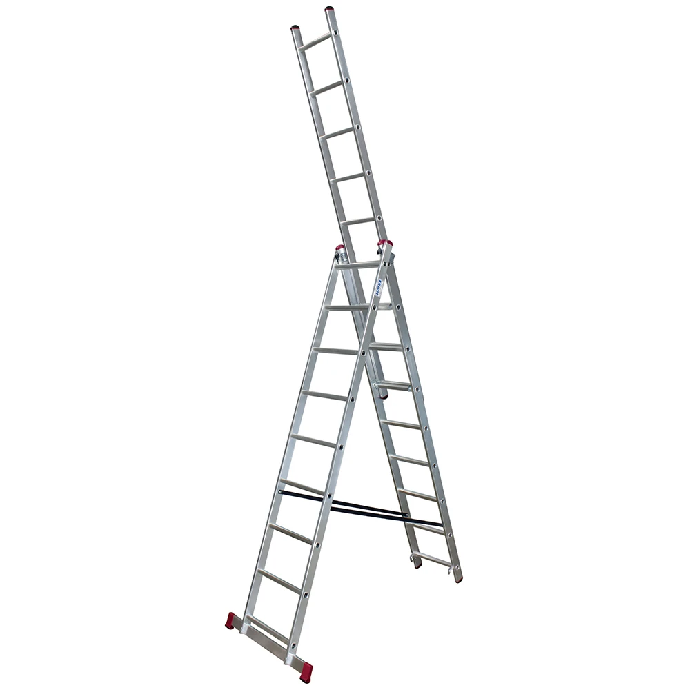 - Алюминиевая трехсекционная лестница с перекладинами, универсального применения: может использоваться как приставная и выдвижная лестница или как стремянка