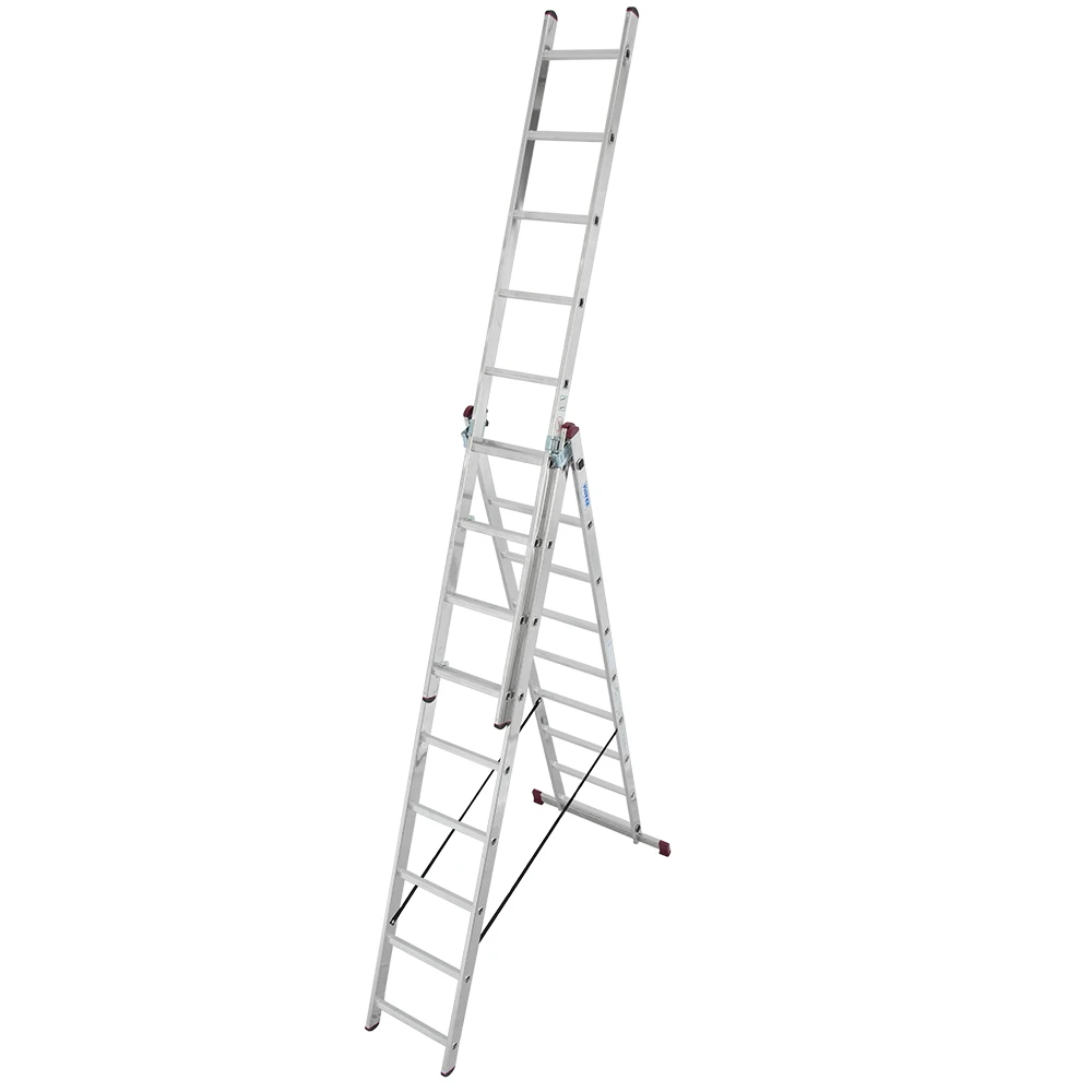 - Алюминиевая трехсекционная лестница с перекладинами, универсального применения: может использоваться как приставная и выдвижная лестница или как стремянка