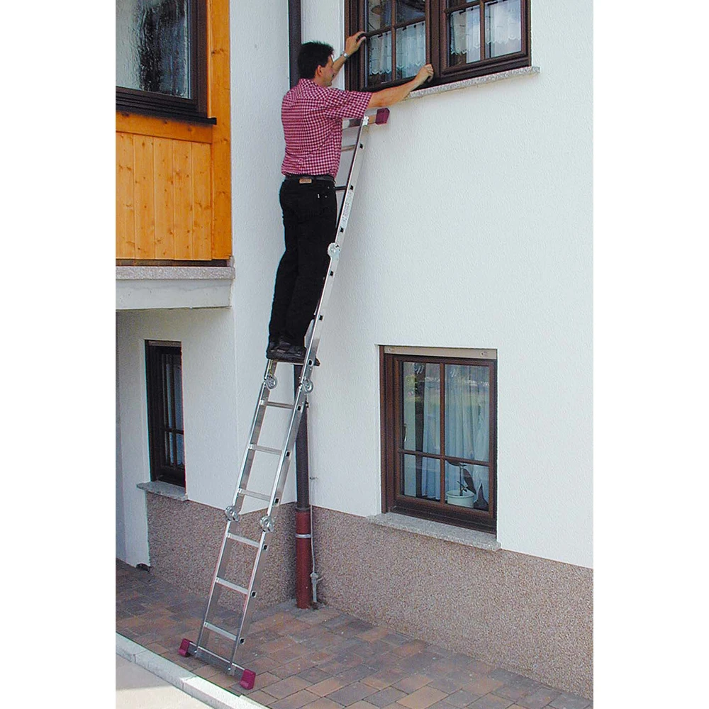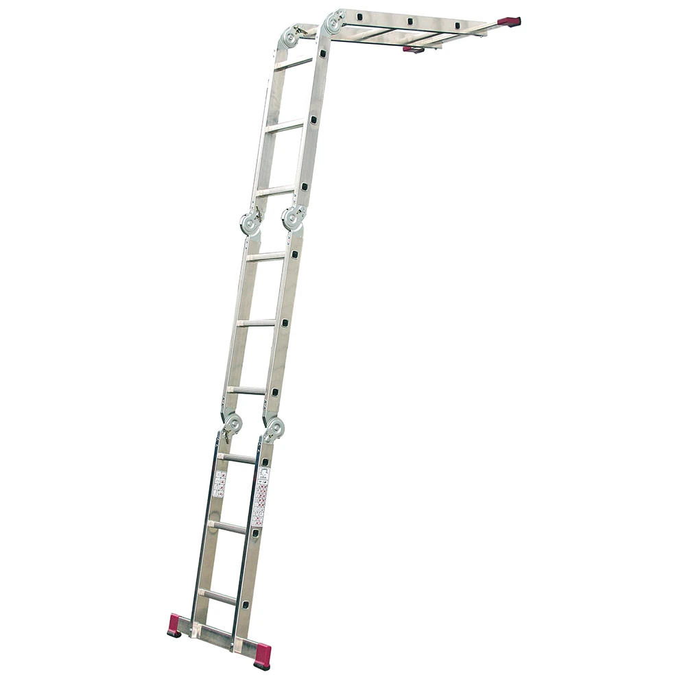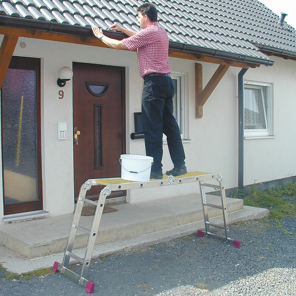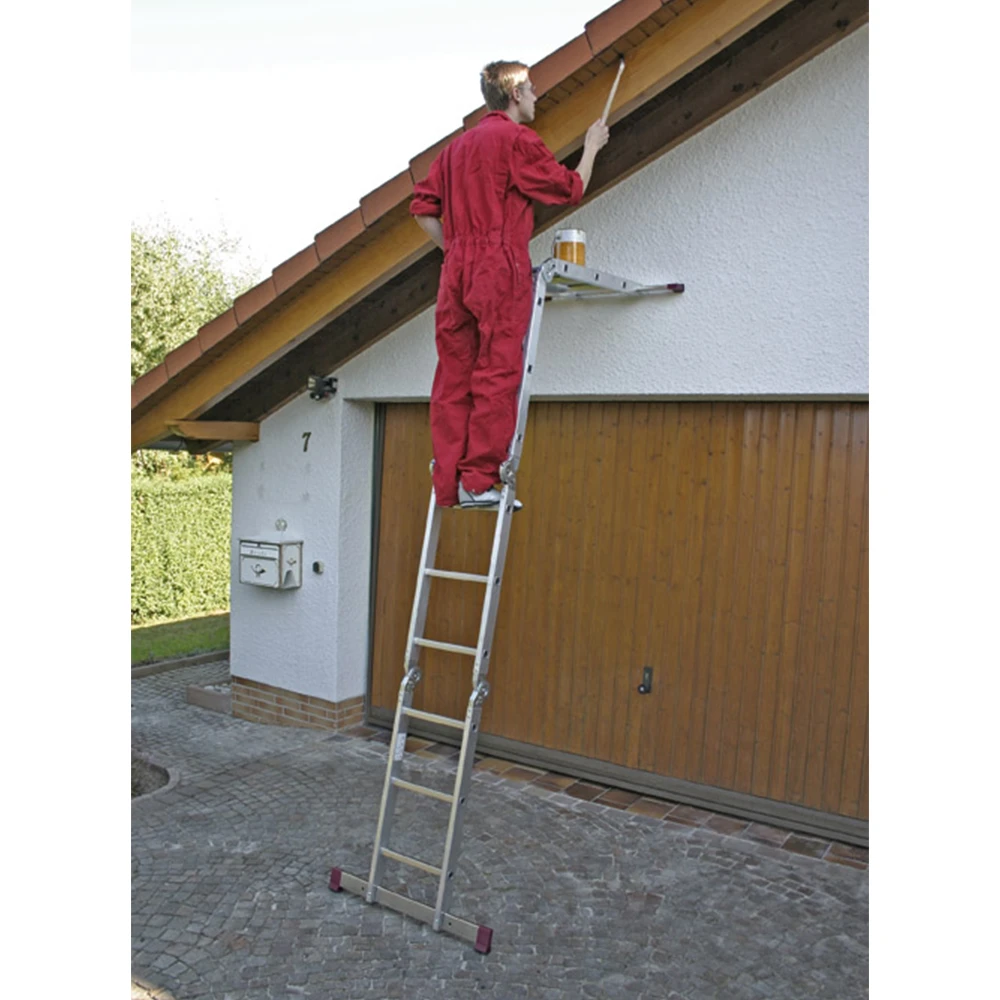 - Четырехсекционная универсальная алюминиевая шарнирная лестница: применяется как двусторонняя стремянка, приставная лестница и рабочая платформа