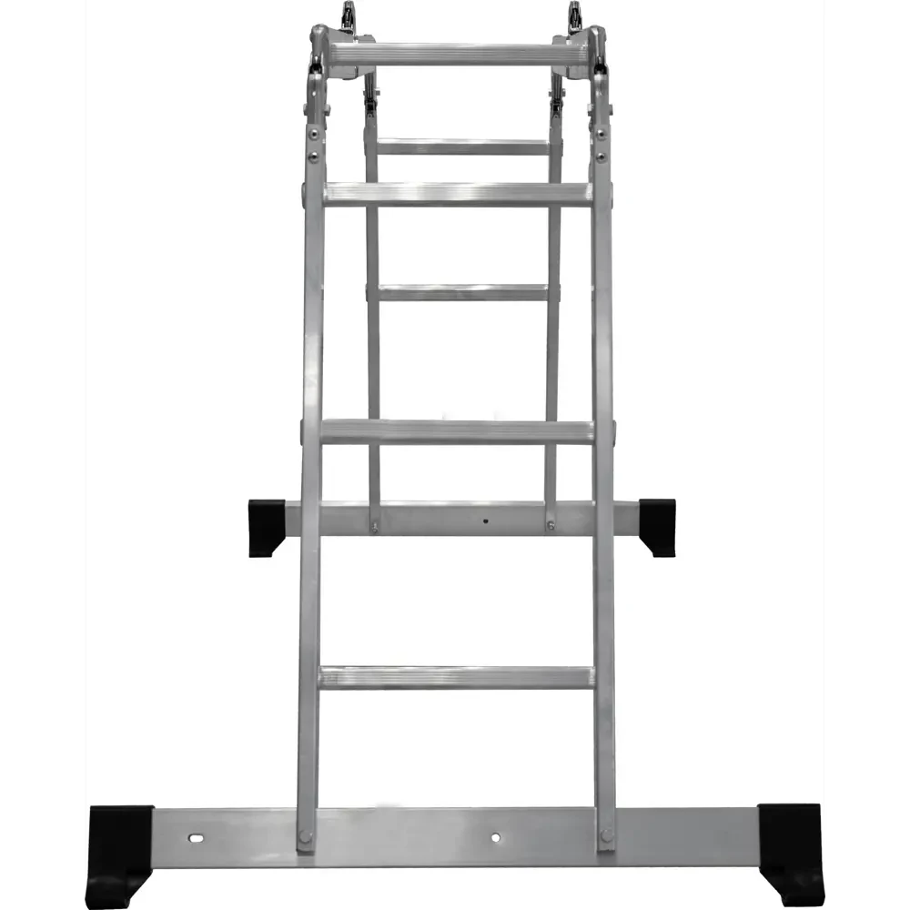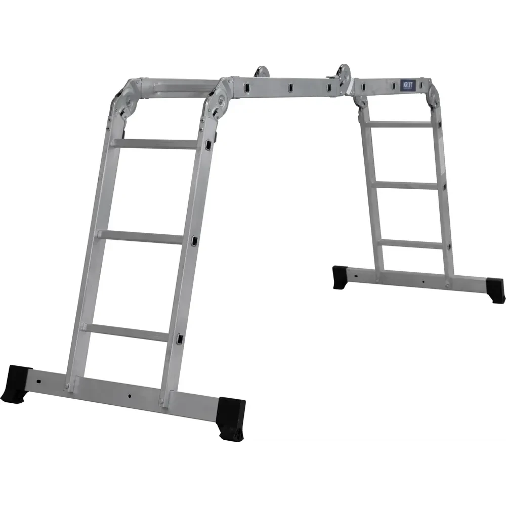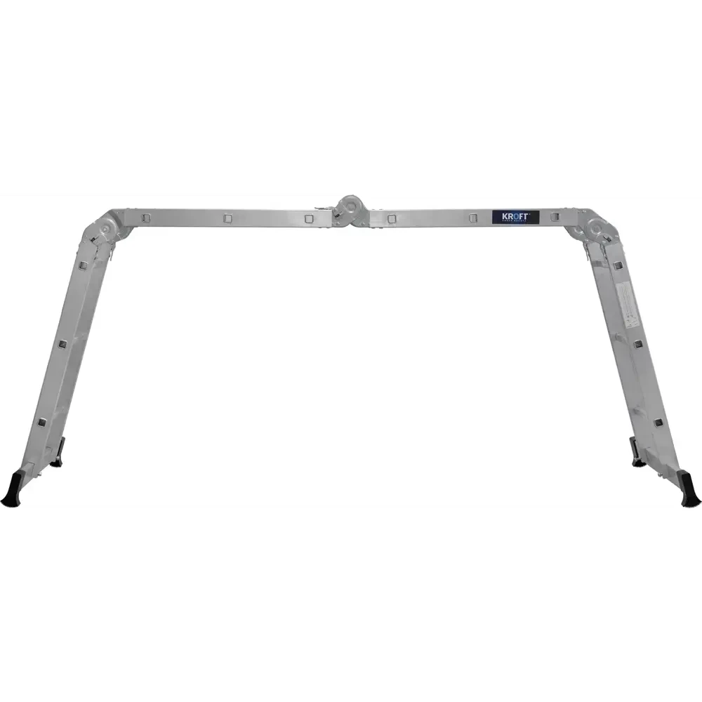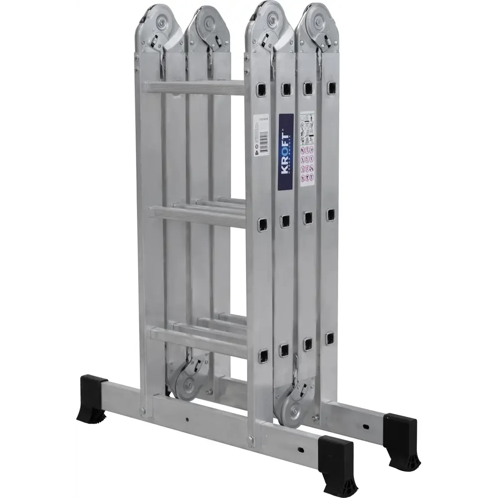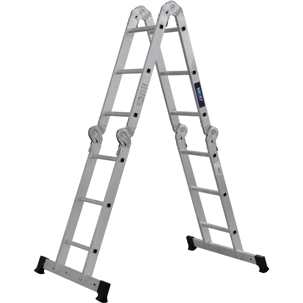 Многофункциональная шарнирная лестница "4 в 1" для бытового использования: Приставная, г-образная с опорой на стену, двухсторонняя стремянка, помост. Шарнирные замки с автоматической фиксацией регулируются одной рукой. Рифленые перекладины 23х23 мм для надёжного сцепления. Две широкие съёмные опорные траверсы стабилизируют конструкцию. Башмаки траверсы из прочного пластика. Не скользят и не повреждают поверхность.
