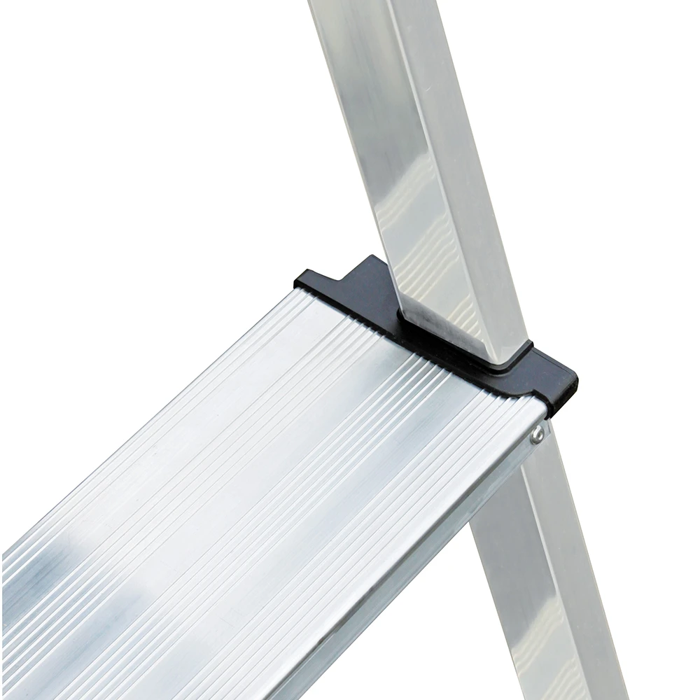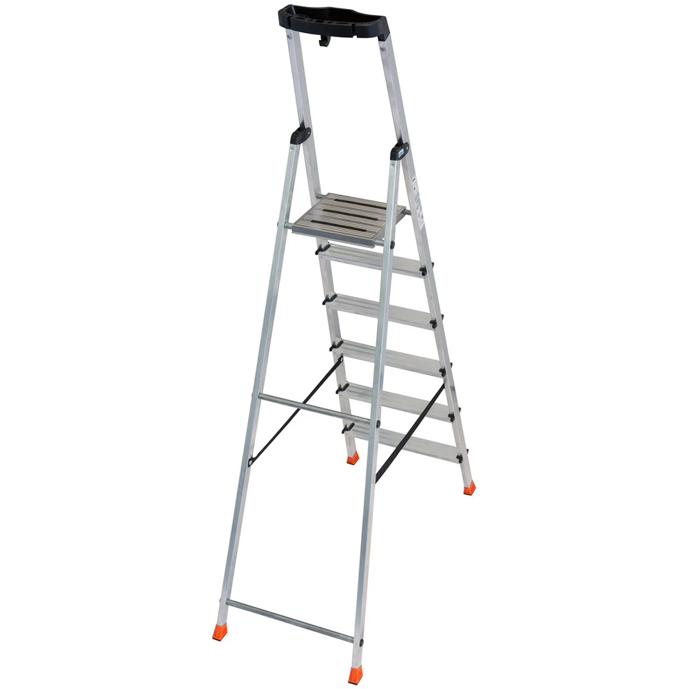 - Односторонняя алюминиевая стремянка c высокой дугой безопасности, с большой алюминиевой площадкой с противоскользящими полимерными накладками