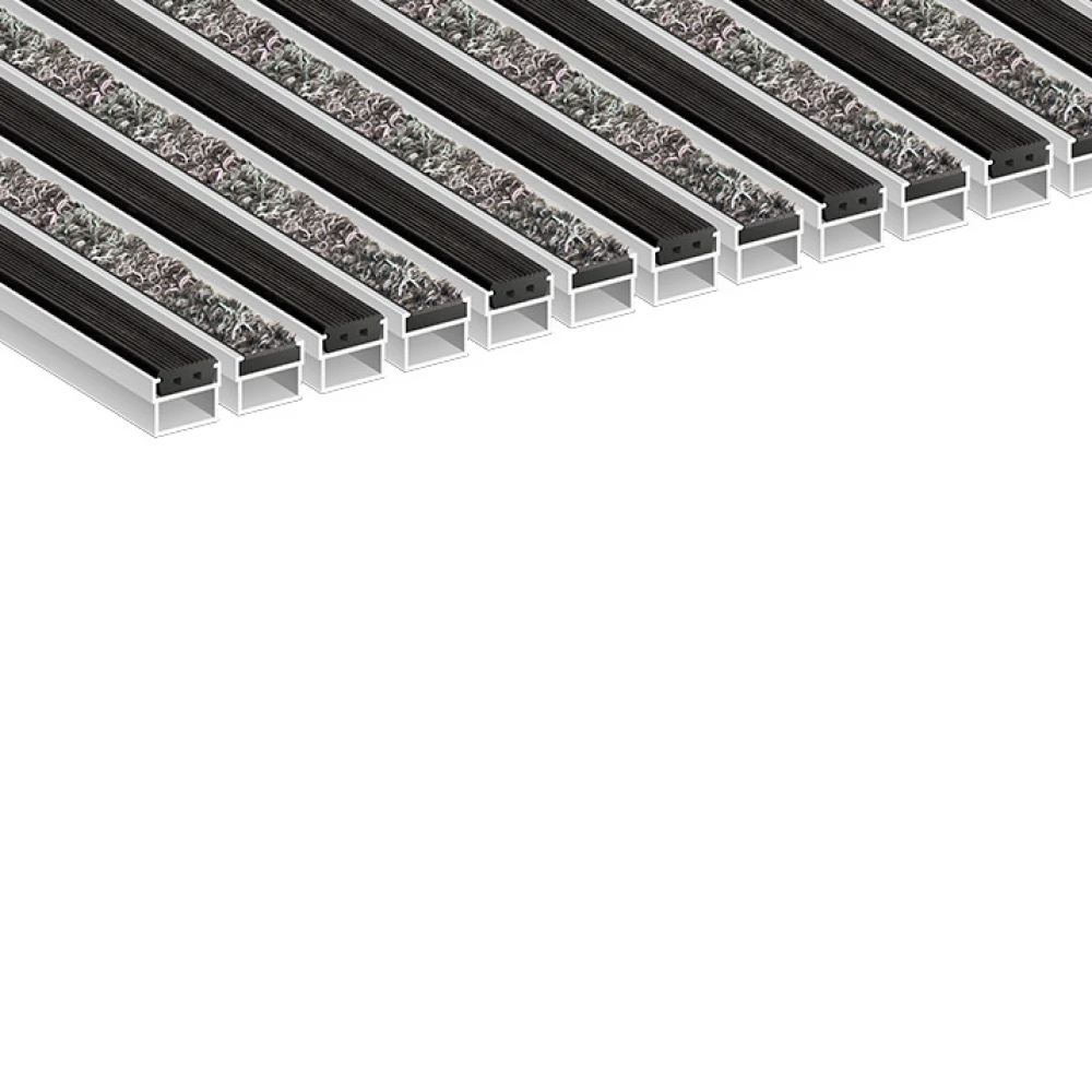 Алюминиевые грязезащитные решетки Стандарт и Стандарт 40 — базовая система, которая наиболее часто устанавливается для помещений с малой и средней проходимостью. Комплектуется чистящими вставками, которые монтируются в несущий профиль. Не рекомендуется использовать, если основание приямка выполнено из кафельной плитки, так как профили не имеют нижней амортизирующей резины. В таких случаях применятся решетки серии Премиум.
