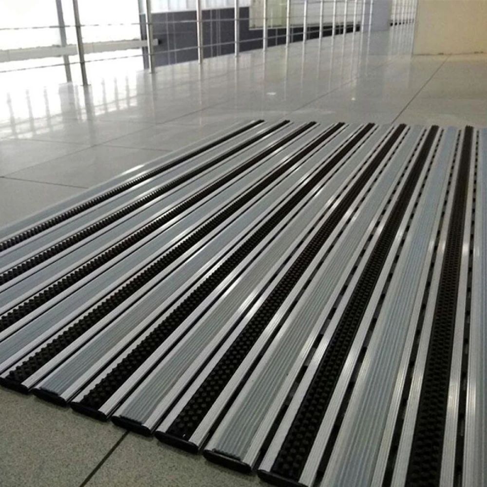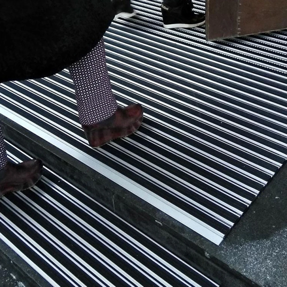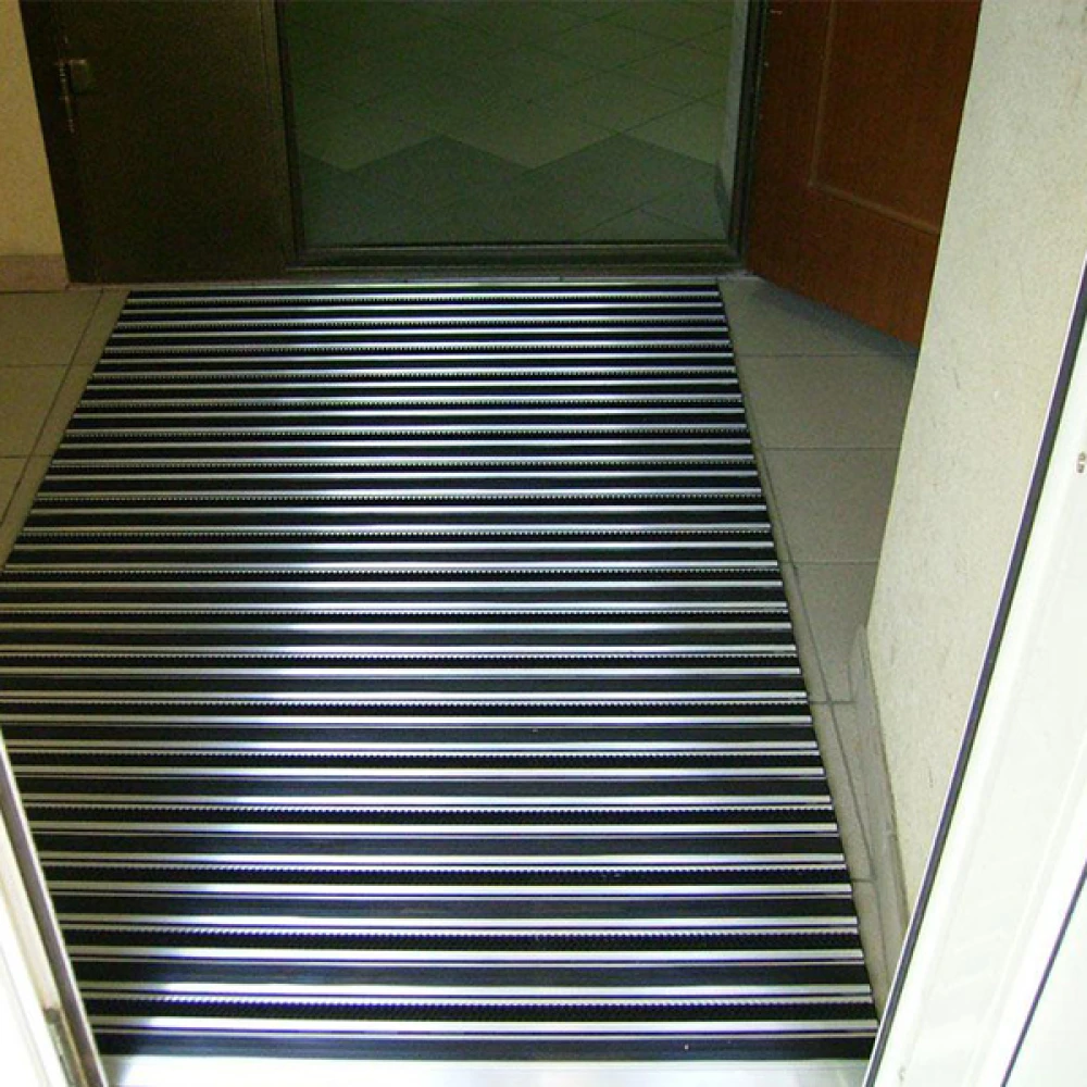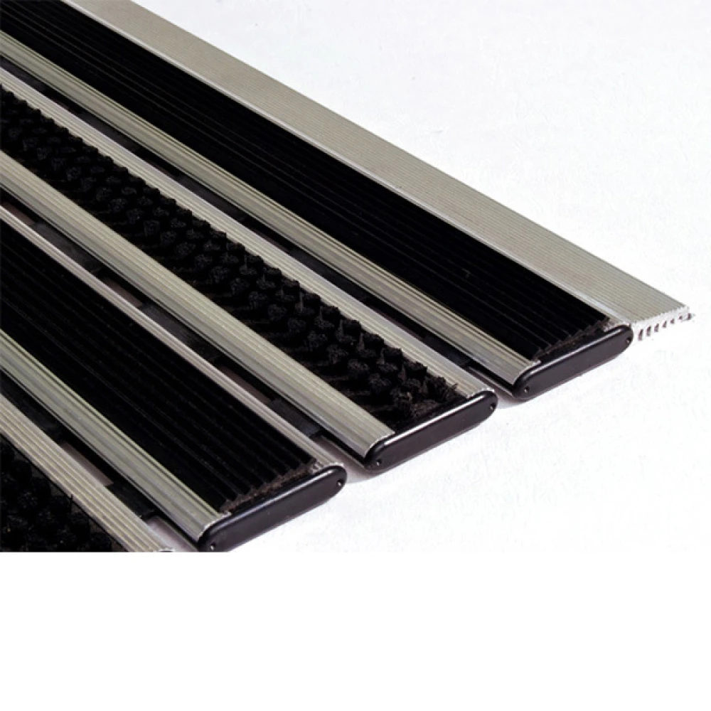 Преимущество комбинации вставок из нейлоновой щетки и рифленой резины особенно заметно при очистке обуви с глубоким протектором. В начале и конце коврика могут быть установлены специальные заходные планки.