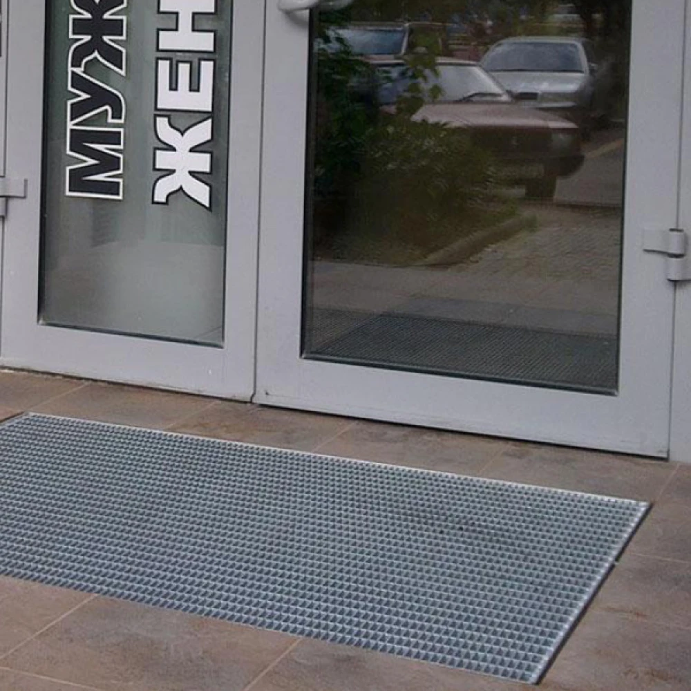 Придверная стальная решетка изготавливается методом прессования несущих и связывающих стальных полос. Антикоррозийная защита выполнена методом горячего оцинкования. Монтаж стальных решеток выполняется с применением пластикового или полимербетонного поддона, или непосредственно в приямок.