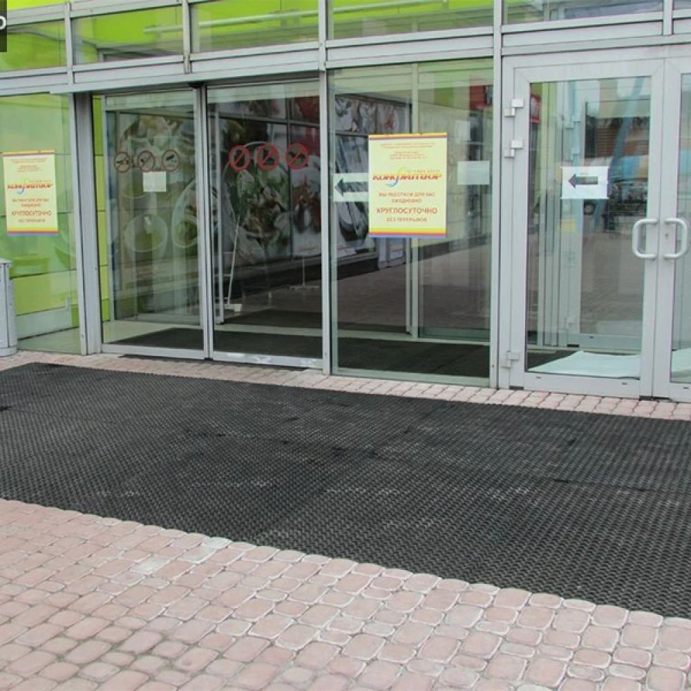 Грязезащитные коврики из натурального каучука с ярко выраженными антискользящими и шумопоглощающими свойствами. Ячеистая структура коврика успешно справляется с проникновением в помещение крупных частиц песка и снега.