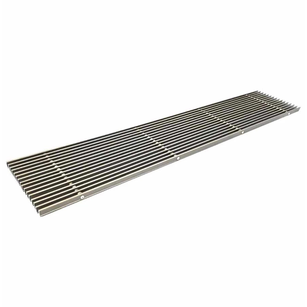 «Титан КВ» Декоративная алюминиевая конвекторная решетка представляет собой конструкцию из алюминиевых планок в форме двутавра, соединенных между собой с помощью пружин и межпрофильными вставками из композитного материала. Изделия предназначены для напольной установки поверх конвекторов отопления или над нишами, в которых уложены инженерные коммуникации.