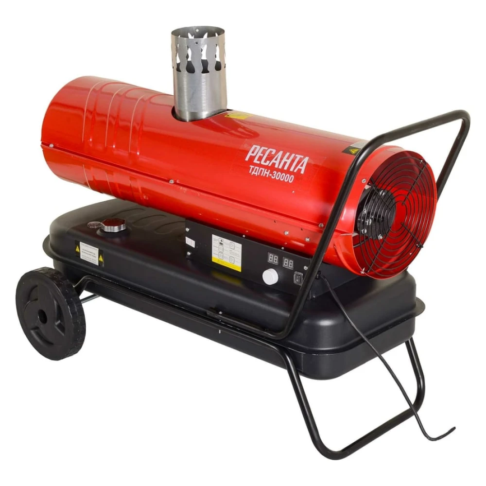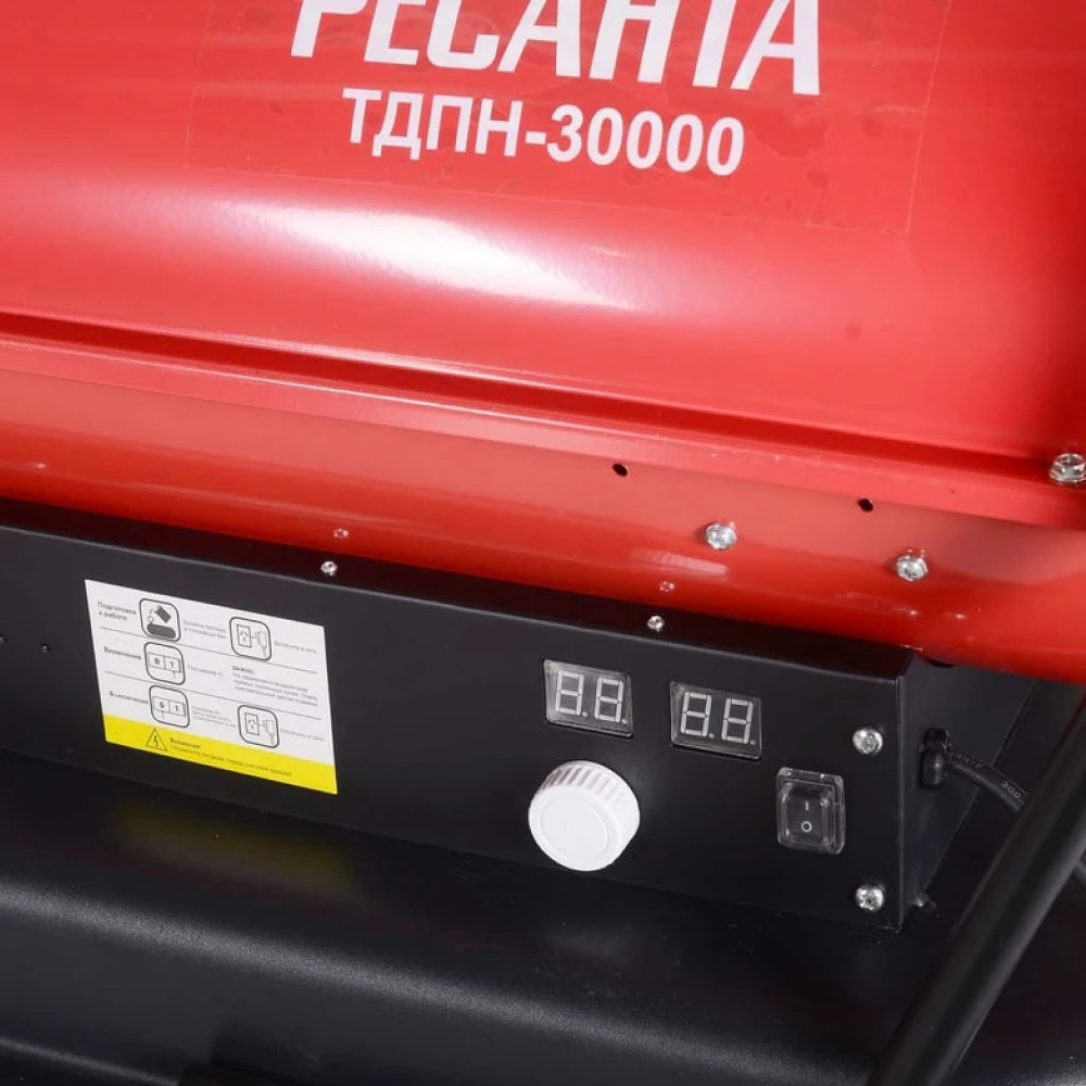 Тепловая пушка имеет простое управление. Термостат автоматически поддерживает заданную температуру, в процессе не требуется ручное регулирование настроек. Среди отличительных особенностей модели стоит отметить и соответствие нормам пожарной безопасности. Имеется защита от перегрева, а при угасании пламени по любой причине дизельная тепловая пушка автоматически отключается. Для безопасной эксплуатации также предусмотрена защита от воспламенения. Для удобства транспортировки Ресанта ТДПН-30000 оснащена колесами.