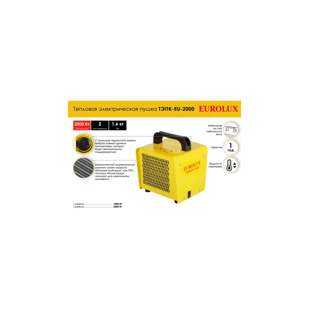 Электрическая тепловая пушка Eurolux ТЭПК-EU-2000 с керамическим нагревателем обладает высокой скоростью нагрева выходящего воздуха и обеспечивает обогрев жилых и производственных помещений площадью до 20 кв.м.