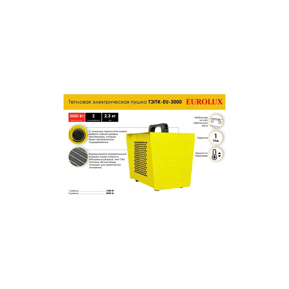 Компактная, но в то же время производительная модель электрической теплопушки Eurolux ТЭПК-EU-3000 – отличный вариант для обогрева помещений разного назначения, таких как, например, стройплощадка или производственный цех. Её мощность составляет 3кВт. Непосредственно нагрев осуществляется керамическим элементом, через который под большим напором, создаваемым вентилятором, проходит воздух. В теплопушке реализованы два режима работы: максимальный нагрев – 3 кВт, экономный – 1.5.