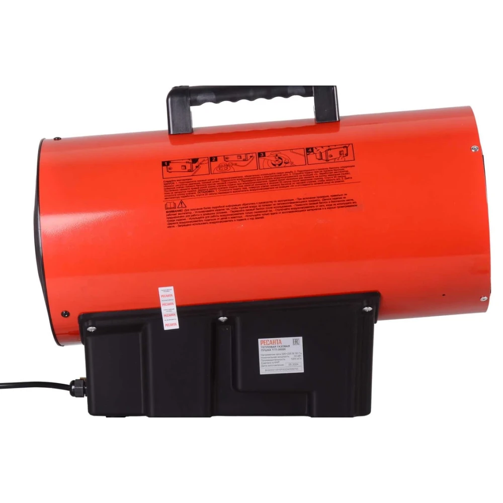 - Удобство транспортировки. Удобная ручка на корпусе упрощает транспортировку газовой тепловой пушки Ресанта ТГП-30000