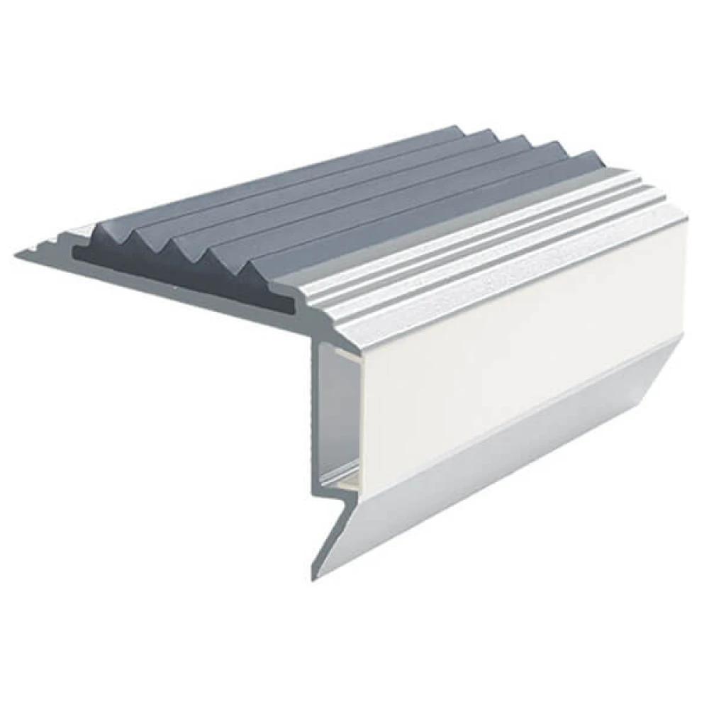 Алюминиевый накладной профиль GlowStep45 со съёмной гибкой вставкой из термоэластопласта и светодиодной подсветкой предназначен для установки на углах ступеней лестниц в качестве противоскользящего профиля безопасности, заметного и в условиях слабого или отсутствующего освещения.