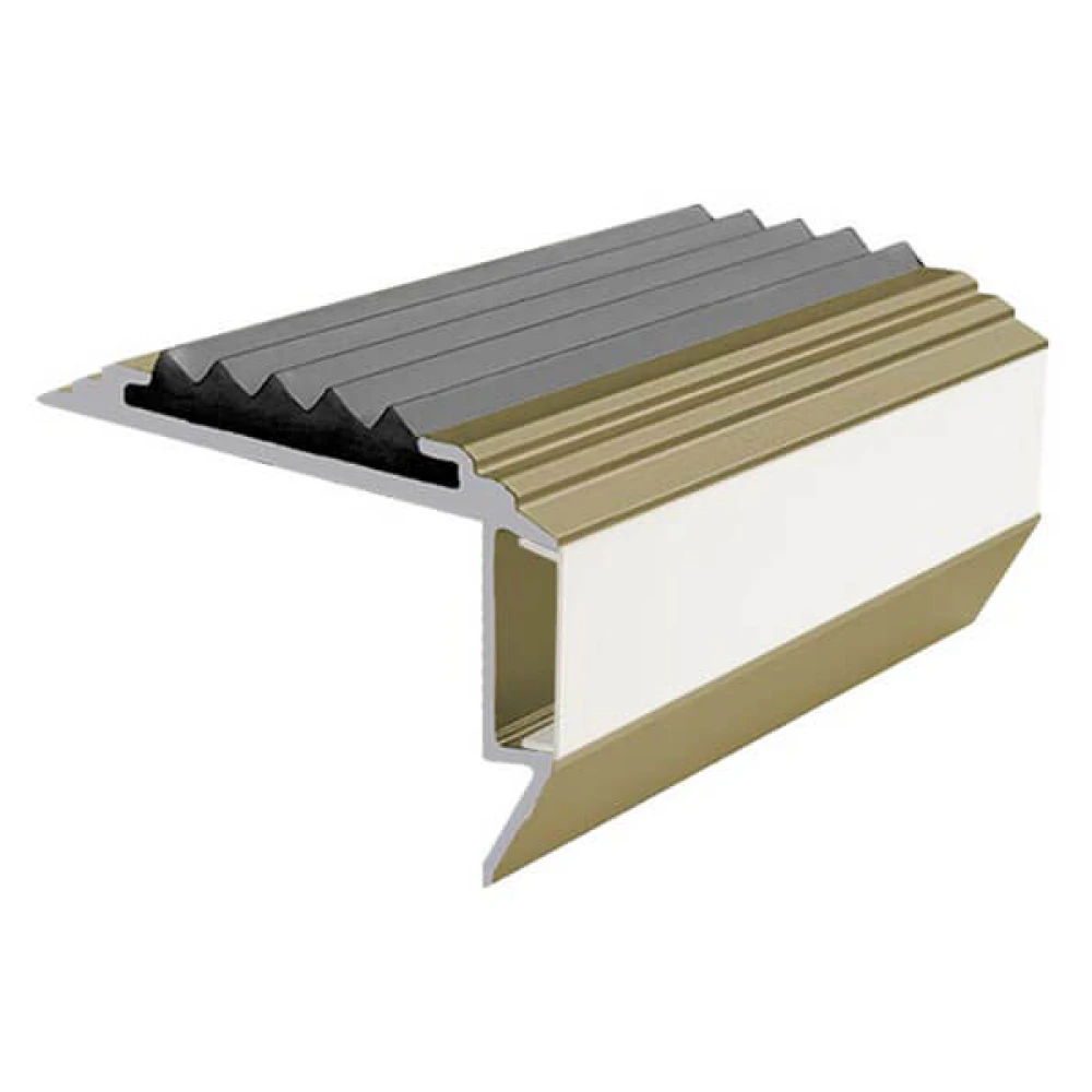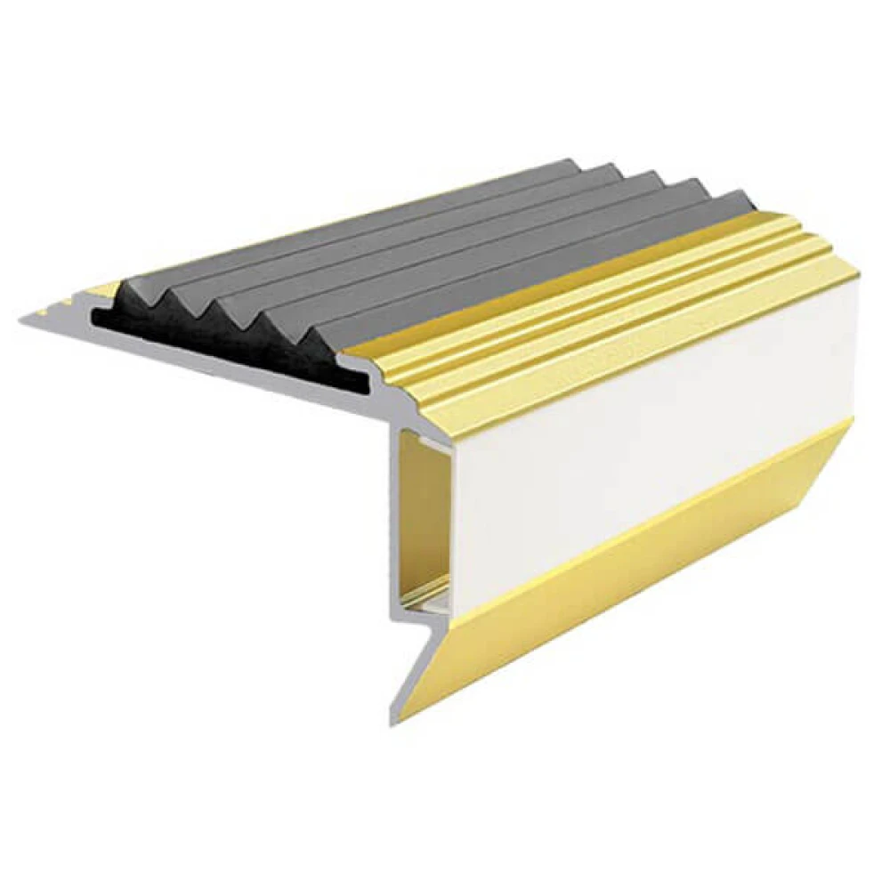 Алюминиевый накладной профиль GlowStep45 со съёмной гибкой вставкой из термоэластопласта и светодиодной подсветкой предназначен для установки на углах ступеней лестниц в качестве противоскользящего профиля безопасности, заметного и в условиях слабого или отсутствующего освещения.