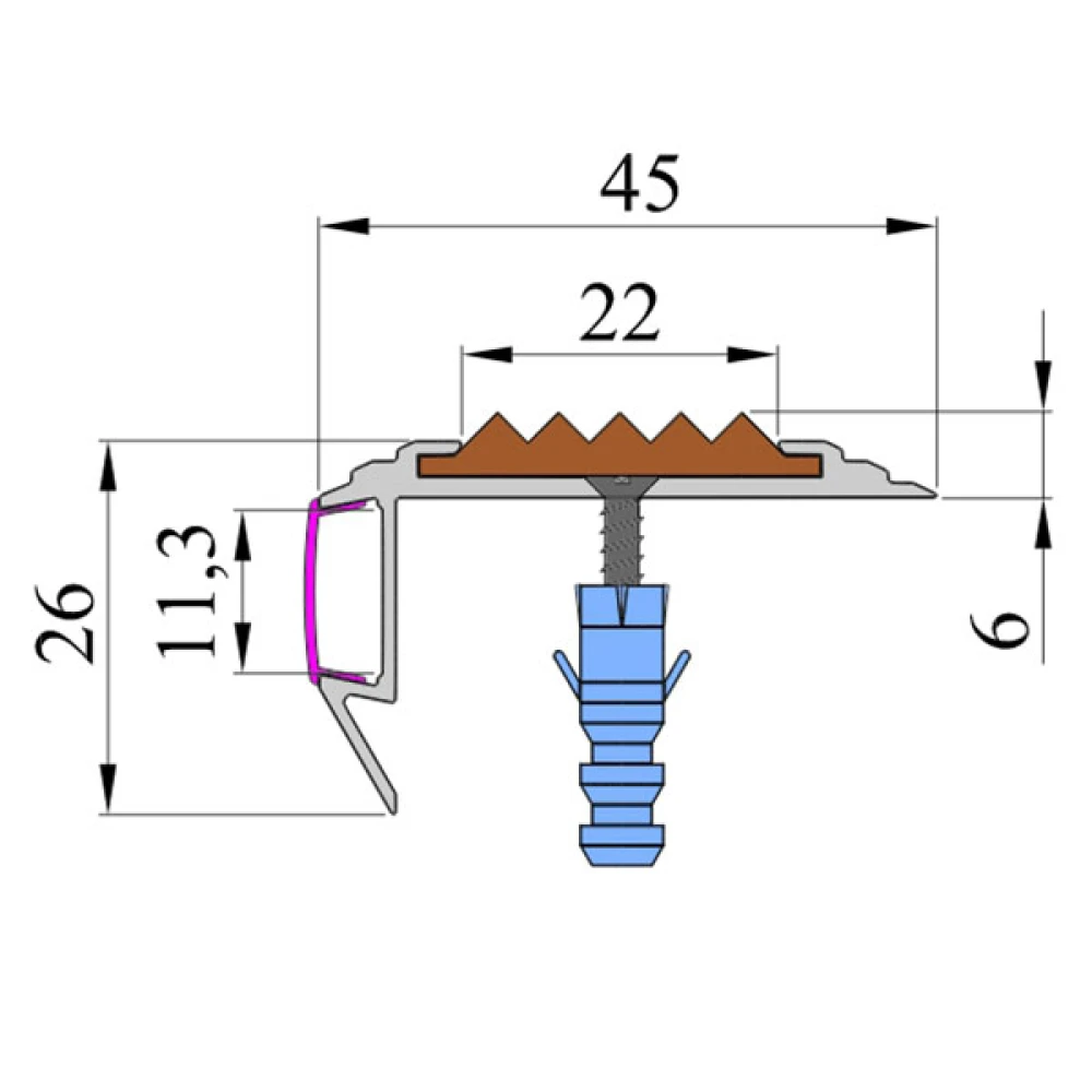 Ширина рабочей поверхности профиля - 45 мм, высота - 6 мм, длина декоративной ножки профиля - 26 мм.