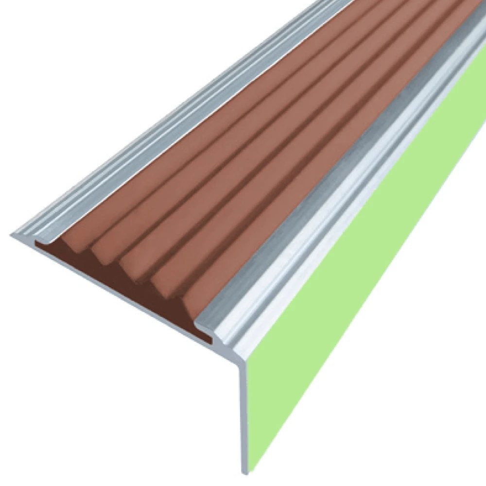 Алюминиевый накладной угол-порог ЕвроСтандарт с одной вставкой против скольжения (АУ38+Ф) + ФОТОЛЮМИНЕСЦЕНТНАЯ полоса (время послесвечения которой около 20 часов) предназначен для установки на поверхности ступеней лестниц в качестве противоскользящего профиля безопасности и как декоративная отделка.