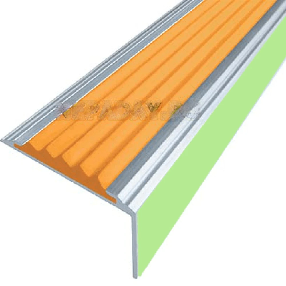 Алюминиевый накладной угол-порог ЕвроСтандарт с одной вставкой против скольжения (АУ38+Ф) + ФОТОЛЮМИНЕСЦЕНТНАЯ полоса (время послесвечения которой около 20 часов) предназначен для установки на поверхности ступеней лестниц в качестве противоскользящего профиля безопасности и как декоративная отделка.