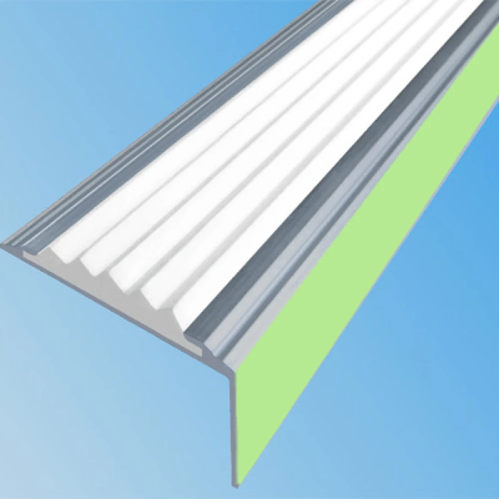 Алюминиевый накладной угол-порог ЕвроСтандарт с одной вставкой против скольжения (АУ38+Ф) + ФОТОЛЮМИНЕСЦЕНТНАЯ полоса (время послесвечения которой около 20 часов) предназначен для установки на поверхности ступеней лестниц в качестве противоскользящего профиля безопасности и как декоративная отделка.