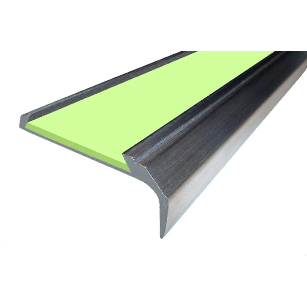 Алюминиевый накладной угол-порог ЕвроСтандарт с одной вставкой против скольжения (АУ42+Ф) + ФОТОЛЮМИНЕСЦЕНТНАЯ полоса (время послесвечения которой около 20 часов) предназначен для установки на поверхности ступеней лестниц в качестве противоскользящего профиля безопасности и как декоративная отделка.