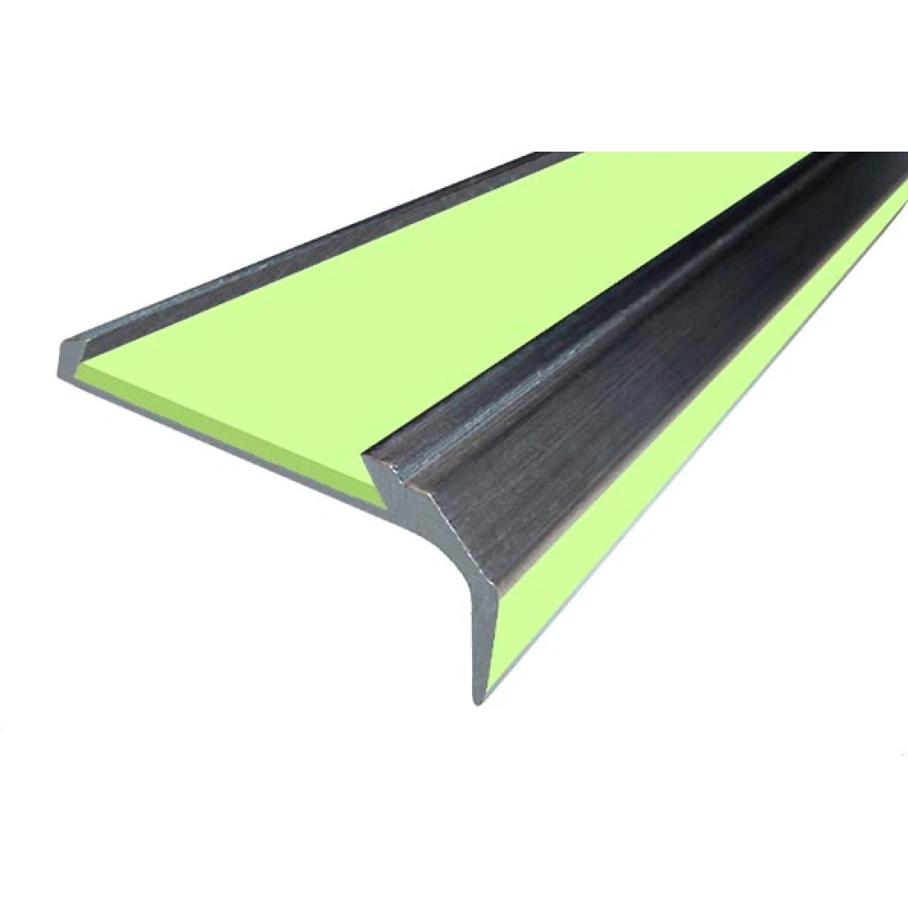Алюминиевый накладной угол-порог ЕвроСтандарт с одной вставкой против скольжения (АУ42+Ф) + ФОТОЛЮМИНЕСЦЕНТНАЯ полоса (время послесвечения которой около 20 часов) предназначен для установки на поверхности ступеней лестниц в качестве противоскользящего профиля безопасности и как декоративная отделка.