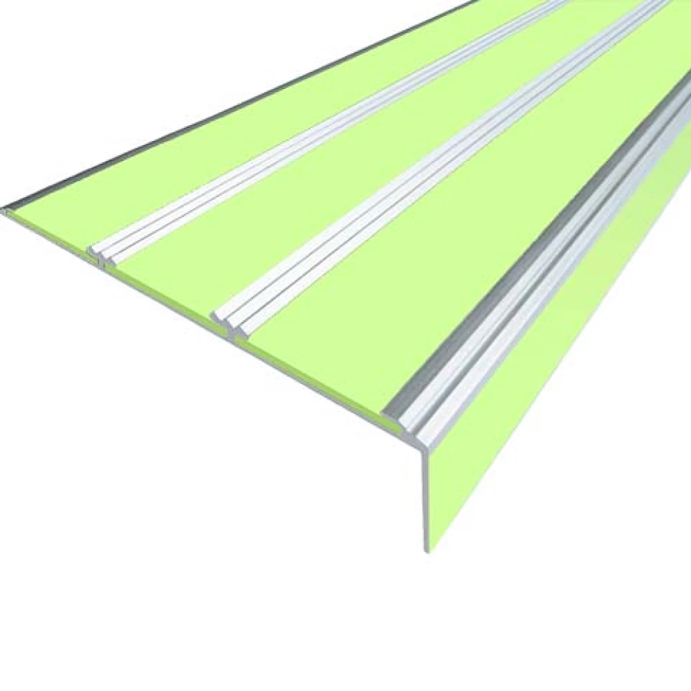 Накладной Угол на ступень в алюминиевом профиле с ФОТОЛЮМИНИСЦЕНТНЫМИ вставками (время послесвечения около 20 часов) обеспечивает безопасное движение людей, как с ограниченной функцией зрения, так и является маркером в тёмное время или при отсутствии искусственного освещения для безопасного движения и в момент эвакуации.