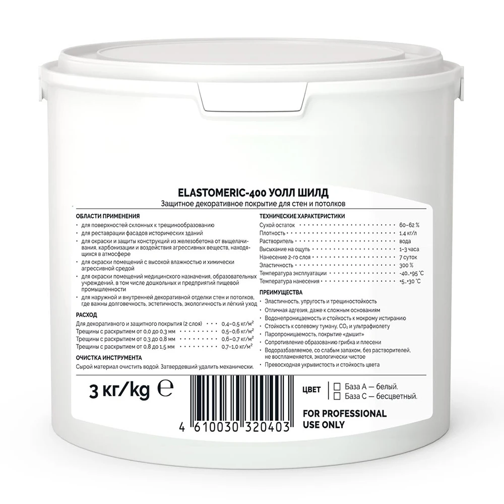 ELASTOMERIC - 400 Wall Shield – готовое к применению, однокомпонентное, матовое, декоративное покрытие на основе самосшивающейся, эластомерной, 100%-ой акриловой смолы, модифицированной эпоксисиланом для бетонных конструкций, стен и потолков, отличающейся повышенной водостойкостью, упругостью и долговечностью.