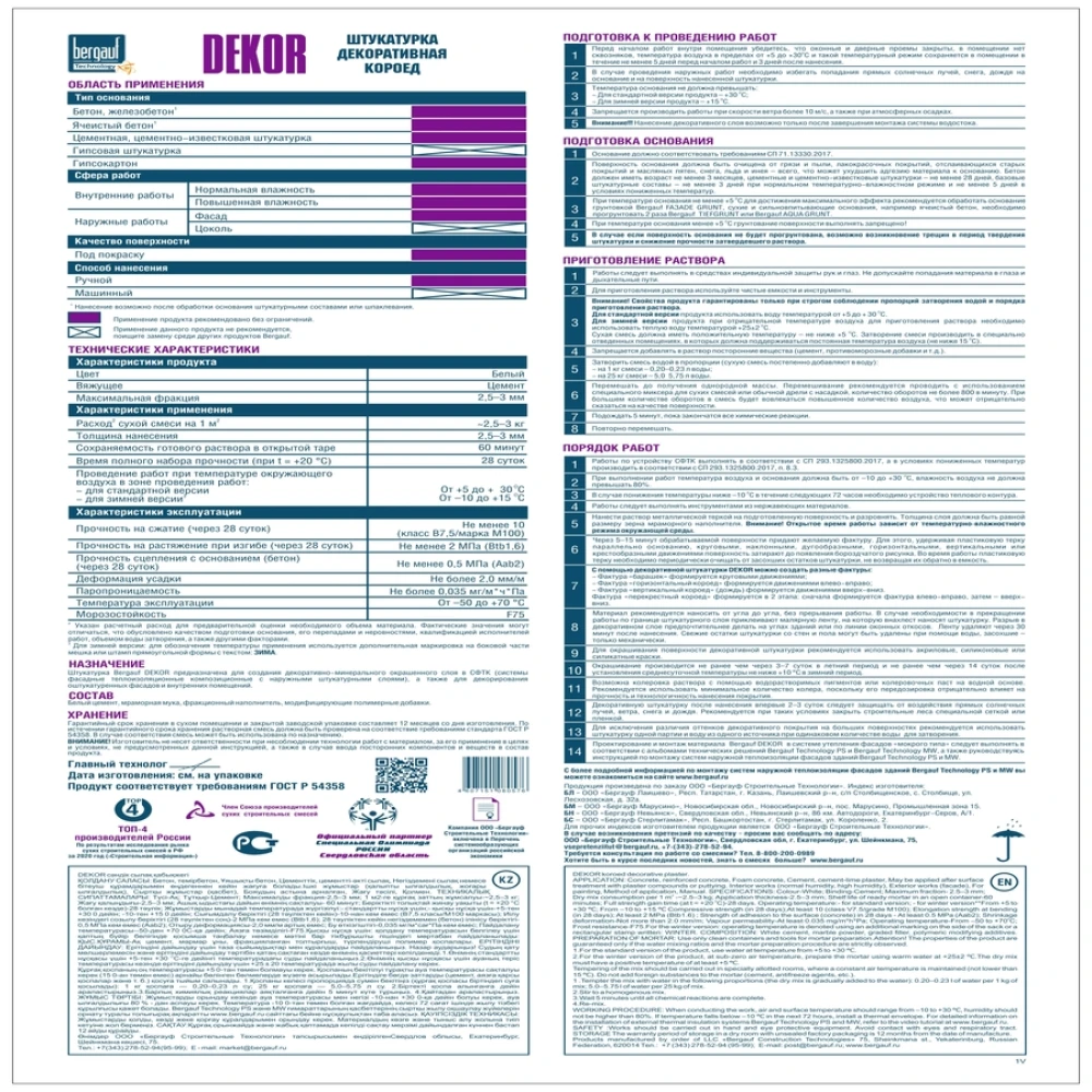 Технические характеристики Штукатурка декоративная Bergauf Dekor короед, 25 кг