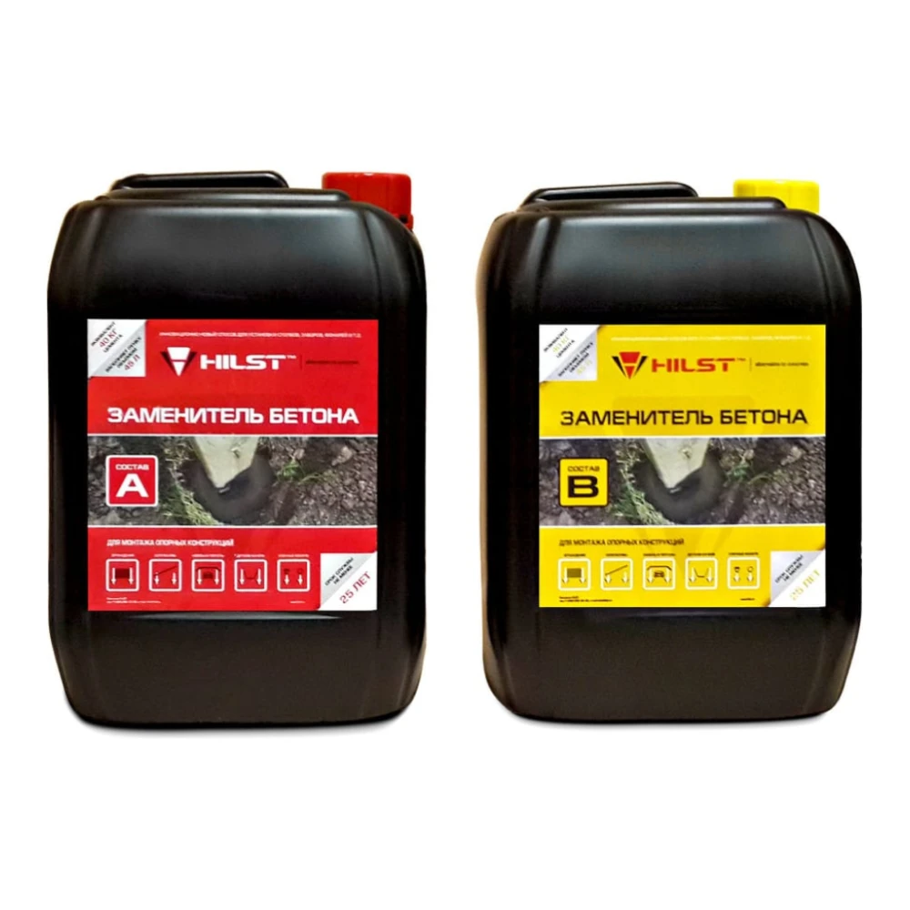 Уникальный продукт для быстрого и легкого монтажа опорных конструкций: столбы для забора, дорожные знаки, фонари освещения, мачты, антенны, опоры трубопроводов, вентилируемые и сплошные заборы. Продукт обладает высокой проникающей способностью. 10 литров готового состава могут заменить 800 кг сухой бетонной смеси. В комплект поставки входят две канистры объемом по 5 л.