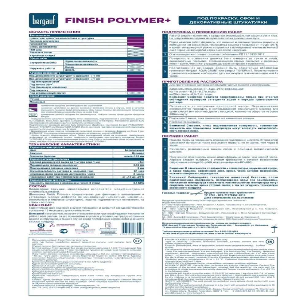 Технические характеристики Суперфинишная полимерная шпатлёвка Bergauf Finish Polymer +, 20 кг