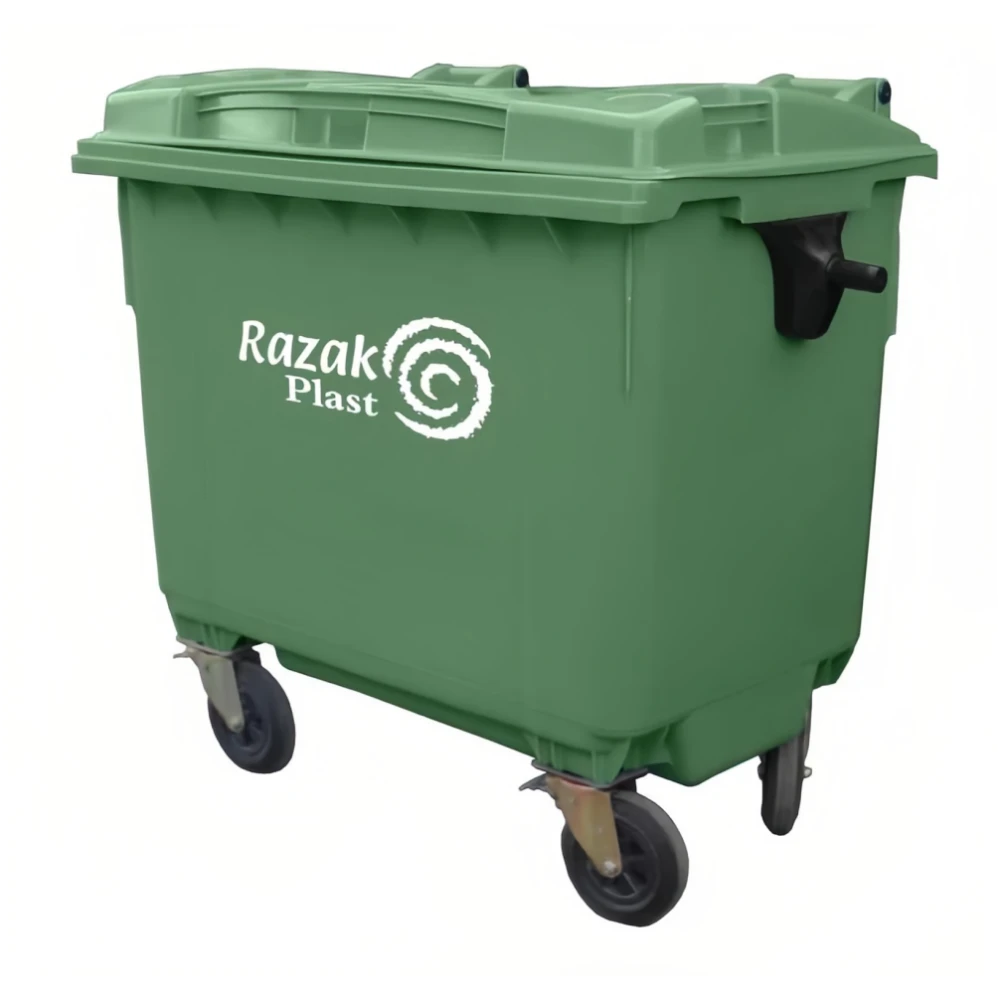 Контейнер для отходов Razak сочетает в себе вместительность, компактные размеры и удобство перемещения. Высокий бак легко опорожняется вручную или с помощью захвата мусороуборочной машины. А колесный механизм не мешает устойчивому положению конструкции и позволяет легко перемещать контейнер.