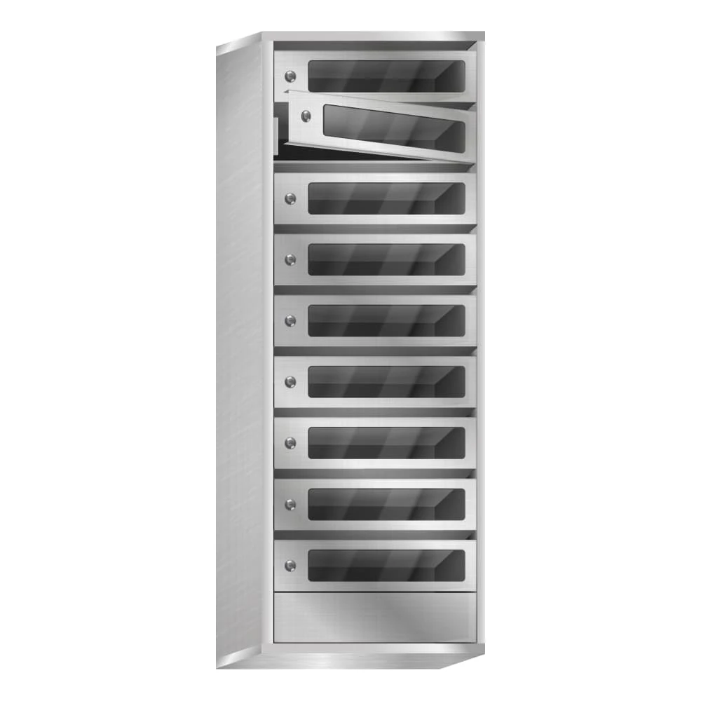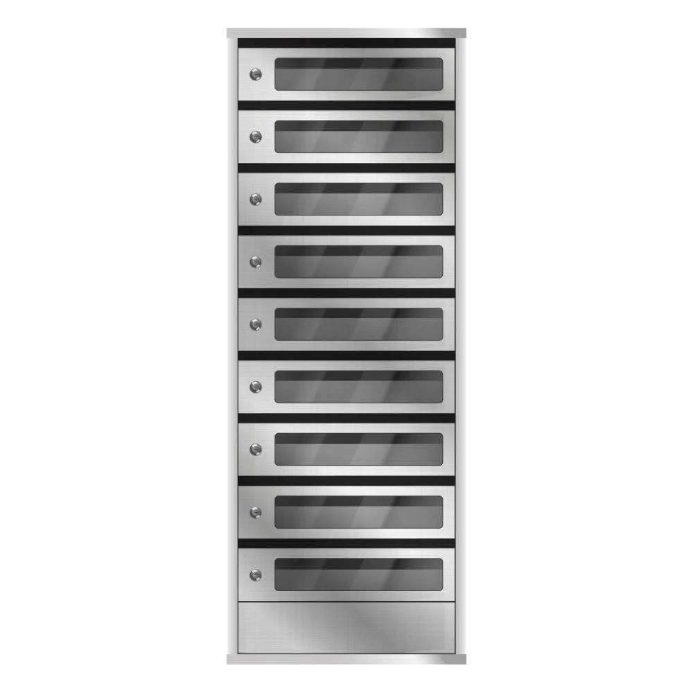 Ящики оснащены смотровыми окошками из прозрачного негорючего, небьющегося поликарбоната толщиной 2 мм, которые позволяют буквально с одного взгляда понять, есть ли внутри письма, это очень удобно и практично. Размер стеклянных окошек в дверцах ящиков 220*60 мм. Также окно можно заменить вставкой из нержавеющей стали (матовой или зеркальной).